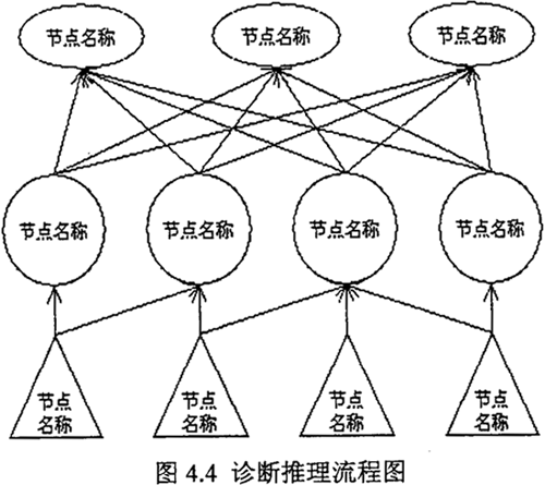 專家知識輸入引擎模塊內容如圖4.3所示,該模塊的核心是用圖形化的方式建立診斷推理流程圖,該流程圖是由分布三個層次上的多個節(jié)點及節(jié)點間的連線所組成,如圖4.4。診斷推理流程圖中,底層為“數(shù)據(jù)”層,這里的數(shù)據(jù),可以是測量參數(shù)、傳感器的輸出、工作狀態(tài)、檢修記錄等多種廣泛意義上的參數(shù),中間層為“故障現(xiàn)象”層,這里的癥狀現(xiàn)象可以是能直接觀察到的現(xiàn)象(如工作條件、參數(shù)范圍、參數(shù)變化等),也可以是間接的現(xiàn)象,即多種廣泛意義上的現(xiàn)象。最上層為“故障原因”層。用連線相連彼此相關的“數(shù)據(jù)”與“故障現(xiàn)象”或“故障現(xiàn)象”與“故障原因”。這樣構成診斷推理流程圖。