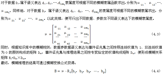 模糊邏輯主要應(yīng)用模糊規(guī)則庫進(jìn)行模糊邏輯關(guān)系運(yùn)算最終得出推理結(jié)果,模糊規(guī)則庫采用圖4.6所示的專家知識庫結(jié)構(gòu)。首先對數(shù)據(jù)、參數(shù)進(jìn)行模糊化處理,進(jìn)入推理機(jī)的數(shù)據(jù)與參數(shù),根據(jù)知識庫中不同的語義表達(dá),通過合理的選擇與構(gòu)造模糊隸屬函數(shù),得出相應(yīng)的數(shù)據(jù)、參數(shù)在不同語義表達(dá)下的模糊隸屬度。