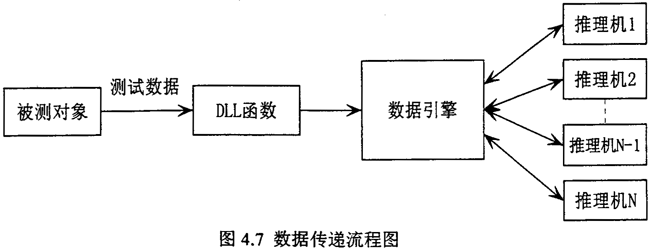 根據(jù)流程圖可知,從故障測試數(shù)據(jù)到數(shù)據(jù)引擎,有兩種數(shù)據(jù)處理方式,一種是故障測試數(shù)據(jù)由數(shù)據(jù)采集系統(tǒng)采集后,可先進(jìn)行預(yù)處理,將故障信號數(shù)據(jù)處理為推理機(jī)所需的故障特征數(shù)據(jù),然后發(fā)送出去,動態(tài)連接庫DLL函數(shù)則通過網(wǎng)絡(luò)接收這些故障特征數(shù)據(jù),同時(shí)對照推理機(jī)向數(shù)據(jù)引擎申請的故障特征變量,將申請的故障特征變量對應(yīng)的值找出,按數(shù)據(jù)引擎規(guī)定的格式反送給申請數(shù)據(jù)的推理機(jī)。另一種是故障測試數(shù)據(jù)由數(shù)據(jù)采集系統(tǒng)采集后,按一定格式直接發(fā)送出去,動態(tài)連接庫DLL函數(shù)則通過網(wǎng)絡(luò)接收這些故障信息數(shù)據(jù),然后再進(jìn)行數(shù)據(jù)預(yù)處理,將故障信息數(shù)據(jù)處理為推理機(jī)所需的故障特征數(shù)據(jù),同時(shí)對照推理機(jī)向數(shù)據(jù)引擎申請的故障特征變量,將申請的故障特征變量對應(yīng)的值找出,再按數(shù)據(jù)引擎規(guī)定的格式反送給申請數(shù)據(jù)的推理機(jī)。