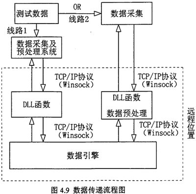 網(wǎng)絡(luò)化遠(yuǎn)程故障診斷的實(shí)現(xiàn),其關(guān)鍵是遠(yuǎn)程數(shù)據(jù)的傳送、存貯及數(shù)據(jù)交換處理。故障診斷系統(tǒng)遠(yuǎn)離故障設(shè)備現(xiàn)場,只要故障現(xiàn)場故障測試數(shù)據(jù)能即時(shí)通過網(wǎng)絡(luò)傳送到故障診斷系統(tǒng)中,故障診斷系統(tǒng)即能實(shí)現(xiàn)網(wǎng)絡(luò)化遠(yuǎn)程故障診斷。當(dāng)智能故障診斷中的推理機(jī)進(jìn)行推理時(shí),通過數(shù)據(jù)引擎向動態(tài)連接庫DLL函數(shù)申請數(shù)據(jù),這些數(shù)據(jù)是推理時(shí)需要的故障特征參數(shù)變量值。動態(tài)連接庫DLL函數(shù)則通過網(wǎng)絡(luò)直接從故障現(xiàn)場測試采集計(jì)算機(jī)中得到故障信息數(shù)據(jù)。數(shù)據(jù)傳送流程圖如圖4.9 所示。
