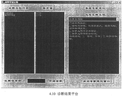 根據(jù)給出的數(shù)據(jù)端口及數(shù)據(jù)格式,即可按用戶的要求設(shè)計(jì)診斷結(jié)果輸出平臺。診斷結(jié)果應(yīng)給出診斷故障的名稱、故障發(fā)生的部位,故障發(fā)生的時(shí)間及程度。對于不同的故障,提示故障發(fā)生的可能原因,給出相應(yīng)的專家建議或維修方法等。圖4.10為本文集成系統(tǒng)的診斷結(jié)果輸出用戶界面。圖4.11為本文集成系統(tǒng)的專家知識庫建立及診斷推理平臺。