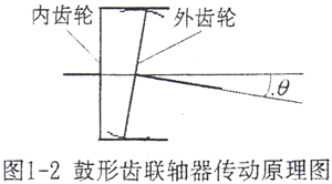 鼓形齒聯(lián)軸器傳動原理如圖1-2所示。鼓形齒聯(lián)軸器的內(nèi)齒輪為一直齒內(nèi)齒輪。外齒輪是齒頂面為一球面的鼓形齒輪。根據(jù)外齒輪齒面產(chǎn)生方式的不同,外齒輪又分為共軛齒面鼓形齒輪和非共軛齒面鼓形齒輪。由于鼓形齒輪加工工藝的關(guān)系,現(xiàn)使用的鼓形齒聯(lián)軸器多為非共軛齒面外齒輪的鼓形齒聯(lián)軸器。共軛齒面的鼓形齒齒面由與內(nèi)齒輪共軛的加工方式產(chǎn)生;非共軛齒面的鼓形齒齒面相當于在不同端截面逐漸變位的一系列齒輪片相迭而成,變位量與軸向坐標形成的曲線稱為鼓度曲線。鼓度曲線是鼓形齒聯(lián)軸器特有的重要幾何參數(shù),現(xiàn)所用的多為一段圓弧,也有用三段圓弧的,這些圓稱為位移圓。在圓弧鼓度曲線中,有位移圓中心在齒輪軸線上的,有不在軸線上的;有位移圓中心與齒頂球面中心重合的,也有不同中心的。鼓度曲線的設(shè)計無統(tǒng)一理論方法,通常是一經(jīng)驗設(shè)計。究竟采用哪種曲線,有不同的考慮方面,總的待定要求是:(1)在軸間傾角處于最大時不出現(xiàn)棱邊接觸現(xiàn)象;(2)輪齒集中載荷越小越好,而齒面曲率與位移圓曲率成正比,因此位移圓半徑rg應(yīng)盡可能大。鼓度曲線曲率半徑與內(nèi)齒單側(cè)減薄量成正比關(guān)系,即它與齒的嚙合間隙有關(guān),減薄量不足時可能造成干涉,減薄過多則削弱齒的強度且側(cè)隙太大。