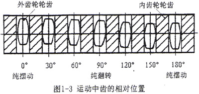 鼓形齒聯(lián)軸器的運動狀態(tài)是復(fù)雜的空間運動,F(xiàn)有資料均把它簡化為展開的平面運動進行分析,在有軸間傾角的狀態(tài)下,將運動分為齒的擺動運動和翻轉(zhuǎn)運動。這兩種運動在嚙合半周中經(jīng)歷純擺動—復(fù)合運動—純翻轉(zhuǎn)—復(fù)合運動—純擺動的循環(huán)運動過程,如圖1-3所示。純擺動—純翻轉(zhuǎn)的相位差為90°。在非純擺動和純翻轉(zhuǎn)運動過程中,內(nèi)外齒的相對運動是擺動運動和翻轉(zhuǎn)運動的復(fù)合運動[68]。顯然這種簡化分析方法是很粗略的,無法確切地描述空間嚙合狀態(tài),但是它對于分析齒向位移、棱邊卡死現(xiàn)象及說明某一輪齒所處周向位置是有意義的。