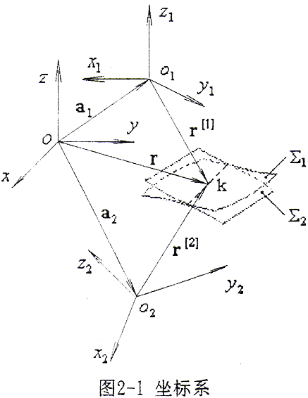 設(shè)K點為兩曲面受力變形后的接觸參考點,a1、a2為靜坐標(biāo)系S原點到兩動坐標(biāo)系S1和S2原點的徑矢;r(1)、r(2)為Σ1、Σ2上K點在S1、S2坐標(biāo)系的徑矢;r為K點在S坐標(biāo)系的徑矢。