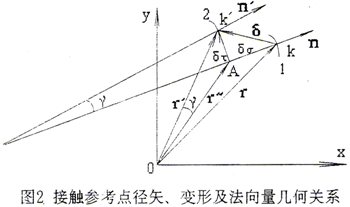 通常情況下,變形量相對于曲面參考點徑矢的大小為微小量,其切向分量更小,主要由撓曲變形引起。由(2-6-1)式知,γ值非常小。一般情況下,可忽略這一法線方向的改變,認(rèn)為變形后的接觸參考點法線方向不變,以便于求解。