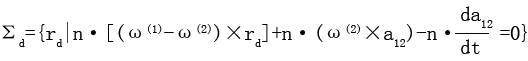 由(2-5-1)式知,它是r(1)、r(2)需滿足的微分方程。Σ1、Σ2在接觸的最初階段,接觸參考點在接觸力作用下,隨著Σ1、Σ2的相對運動,變形逐漸增大,在此階段,不為零。當(dāng)接觸參考點變形達(dá)到最大時,該瞬間變形結(jié)束,回彈尚未開始,顯然,此瞬時,這時的接觸參考點為決定兩曲面運動關(guān)系的點,受力達(dá)到平衡,我們稱這樣的接觸參考點為變形最大點。將這樣的點之徑矢記為rd(1)、rd(2),(2-5-1)式就成為