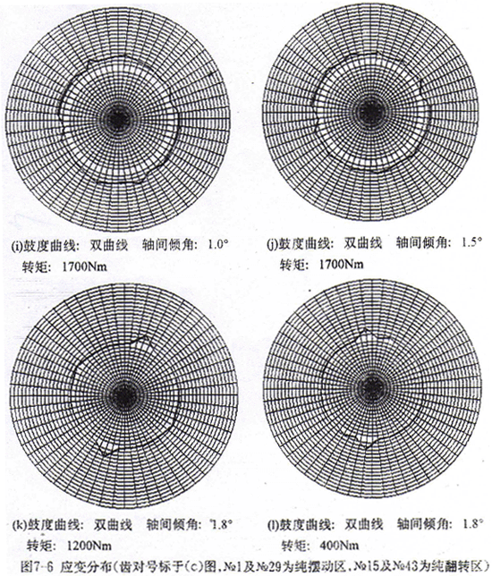 5.圓弧鼓度曲線與優(yōu)化鼓度曲線的測(cè)試結(jié)果相比較,在無(wú)軸間傾角的情況下,二者的最大應(yīng)變無(wú)大的差異,只是分布狀態(tài)有所不同,這是由各種誤差的綜合影響所造成的。當(dāng)軸間傾角逐漸增大,應(yīng)變分布的最大值和最小值之差逐漸增大,但優(yōu)化鼓度曲線的差值變化較圓弧鼓度曲線的要小。當(dāng)軸間傾角超過(guò)設(shè)計(jì)軸間傾角處于最大時(shí),二者的最大應(yīng)變量之比約為2;
