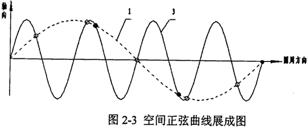 圓柱正弦活齒傳動(dòng)在工作過程中,幾乎每個(gè)活齒都同時(shí)參與嚙合,活齒安裝在主動(dòng)軸與殼體正弦滾道的交叉點(diǎn)處,活齒的安裝位置限制了活齒的數(shù)目n。將空間正弦曲線沿圓柱直母線方向展成平面正弦曲線,如圖2-3所示,其中1線為主動(dòng)軸正弦滾道曲線,3線為殼體正弦滾道曲線。設(shè)正弦曲線切線的斜率有正負(fù)之分,則兩條正弦曲線相交,交點(diǎn)可以分為兩類:一類交點(diǎn)指在交點(diǎn)處兩正弦曲線的切線斜率同號(如圖中黑點(diǎn)所示);二類交點(diǎn)指在交點(diǎn)處兩正弦曲線的切線斜率異號(如圖中白圈所示)。若要求圓柱正弦活齒傳動(dòng)的輸入輸出為同向傳動(dòng)時(shí),活齒應(yīng)安放在二類交點(diǎn)處,此時(shí)活齒的個(gè)數(shù)為n=Z1+Z3;若輸入、輸出為反向傳動(dòng)時(shí),活齒應(yīng)安放在一類交點(diǎn)處,此時(shí)活齒的個(gè)數(shù)為n=|Z1-Z3|。并保證,n≥3。