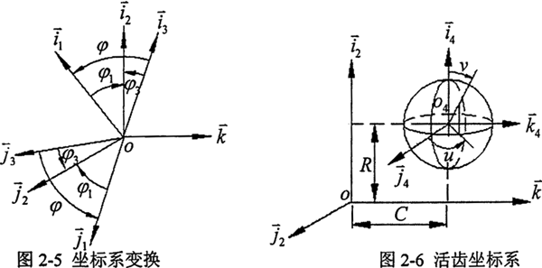 為建立該傳動(dòng)的嚙合方程,使在不同坐標(biāo)系中的各個(gè)矢量進(jìn)行計(jì)算,需將所有矢量轉(zhuǎn)換到統(tǒng)一的坐標(biāo)系中,為方便求解,將所有矢量均轉(zhuǎn)換到導(dǎo)架的坐標(biāo)系σ2中。