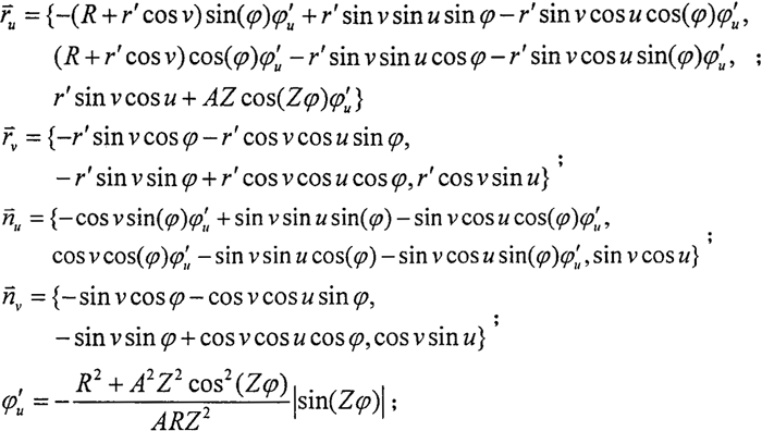 在進(jìn)行圓柱正弦活齒傳動(dòng)接觸強(qiáng)度分析時(shí),需要利用正弦滾道齒面的主曲盆和主曲率半徑,為此需對(duì)正弦滾道齒面的主曲率和主曲率半徑進(jìn)行分析計(jì)算。根據(jù)微分幾何理論,除在曲面上的奇異點(diǎn)之外,法曲率隨著所選取的方向下同而變化,而在一個(gè)非奇異的固定點(diǎn),沿不同方向的法曲率之中有其最大值和最小值,而這最大值法曲率和最小值法曲率及分別稱(chēng)為曲面在該點(diǎn)的兩個(gè)主曲率,當(dāng)主曲率不為零時(shí),主曲率的倒數(shù)稱(chēng)為主曲率半徑;對(duì)應(yīng)主曲率的方向稱(chēng)為主方向,并且兩個(gè)主方向互相垂直。