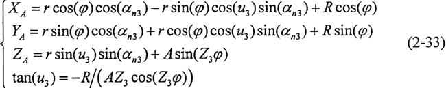 由式(2-33)可求得軌跡曲線LA的切線方程,為便于計(jì)算,將其轉(zhuǎn)換到活齒坐標(biāo)系中,該方程的方向數(shù)為: