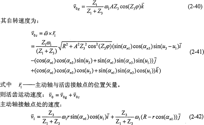 同理,由式(2-35)可以求得活齒中心的運(yùn)動(dòng)速度方向,轉(zhuǎn)換到活齒坐標(biāo)系后,其方向數(shù)為: