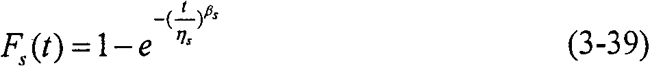 根據(jù)故障樹對圓柱正弦活齒減速器進(jìn)行可靠性的數(shù)字仿真研究。各基本部件壽命分布參數(shù)見表3-5,采用上述算法編程求解。通掃故障樹5000次,產(chǎn)生減速器壽命抽樣值5000個(gè),設(shè)系統(tǒng)最大工作時(shí)間Tmax為1000Oh,將Tmax分為1000個(gè)區(qū)間,統(tǒng)計(jì)減速器壽命抽樣落入各區(qū)間的次數(shù),得到系統(tǒng)平均壽命,即減速器平均無故障工作時(shí)間MTBF為3086h,壽命的方差為6.39×106。根據(jù)仿真結(jié)果進(jìn)行擬合分析,系統(tǒng)壽命服從威布爾分布,即