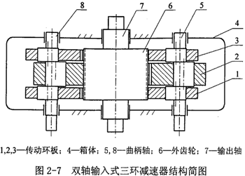 完全平衡雙軸輸入式三環(huán)式減速器如圖2-7所示。其工作原理為:三環(huán)式減速器的曲柄軸在動力的驅(qū)動下同步旋轉(zhuǎn),傳動環(huán)板上的內(nèi)齒圈與輸出軸上的外齒輪相互嚙合,形成了大傳動比,從而實(shí)現(xiàn)了減速及動力傳遞。雙軸同步輸入可以克服傳動機(jī)構(gòu)的死點(diǎn)問題。