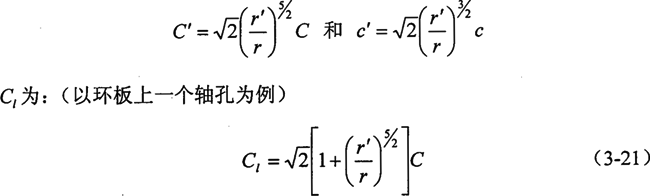 上式是按滑動軸承理論進行的,與我們設(shè)計的油膜浮動裝置有重要區(qū)別。我們設(shè)計的油膜浮動均載方案,共有兩層油膜,即:偏心套與浮環(huán)、浮環(huán)與滾動軸承之間各形成一層共轉(zhuǎn)滑動軸承油膜,設(shè)浮環(huán)內(nèi)外半徑為r、r′,c、c′為浮環(huán)的內(nèi)外半徑間隙,C1為環(huán)板的浮動量,由摩擦學理論可導出共轉(zhuǎn)軸承的浮動量C′和半徑間隙c′與普通滑動軸承的浮動量C和半徑間隙c之間的關(guān)系下: