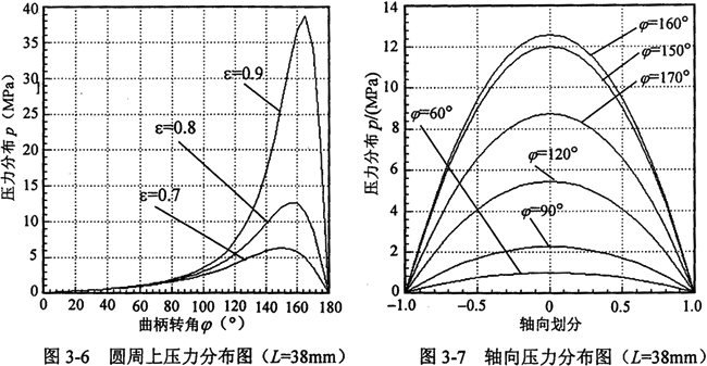 由圖3-6可看出,相同浮動套長度時,圓周上的壓力隨著偏心率的增大而增大,且在壓力最大值時的變化幅度較大。另外,計算還證明:在偏心率相同的條件下,圓周上的壓力隨著浮動套長度增大而增大。