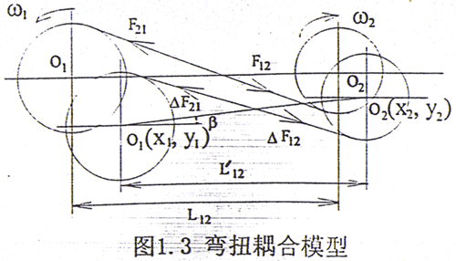 齒輪是機械系統(tǒng)中一個非常重要的部件,主要用于傳遞轉(zhuǎn)子之間的運動。對于外齒輪耦合轉(zhuǎn)子軸承系統(tǒng)的研究已經(jīng)進行了數(shù)十年[14],比較典型的模型有Fukuma[15]、IWATSUBO[16]、Kahraman[17]模型和彎扭耦合模型[18],其中[15,18]中的模型分別如圖1.2和圖1.3所示。這些模型的共同特點是將嚙合的輪齒看成能夠產(chǎn)生變形的彈簧,同時考慮了齒輪中心的橫向位移和繞中心轉(zhuǎn)動的扭轉(zhuǎn)角位移,這樣對一個外齒輪而方Fukuma[15]模型就具有三個自由度,一對嚙合的外齒輪共有六個自由度;而彎扭耦合模型[18]則考慮了齒輪之間的嚙合關(guān)系,這一關(guān)系相當與給系統(tǒng)增加了一個約束,使得系統(tǒng)的自由度減少了一個,因此是一個五自由度模型。