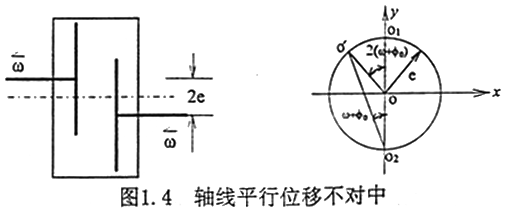 不對中具有一些典型的特征,如不對中比較嚴重時會使軸承的油膜壓力偏離正常值,聯(lián)軸器不對中時聯(lián)軸器兩端軸承的振動較大,軸心位置不穩(wěn)定,而且在振動頻譜中二倍頻分量幅值較大等。而對于齒輪聯(lián)軸器不對中產(chǎn)生倍頻振動分量的機理研究又是其中的一個重點。文獻[68]指出,由于安裝時轉(zhuǎn)子軸心線不對中引起的振動,在用電機驅(qū)動的轉(zhuǎn)子系統(tǒng)中,當電機軸與負載機械由齒輪聯(lián)軸器連接時,電機軸存在二倍頻的振動,而在單獨運動時,倍頻振動立即消失,這表明倍頻振動完全是齒輪聯(lián)軸器耦合的結(jié)果。文獻[64,65]解釋了由于齒輪聯(lián)軸器不對勁中而產(chǎn)生二倍頻振動的機理,以[65]中的軸線平行位移不對中為例見圖1.4,圖中ω為轉(zhuǎn)子的轉(zhuǎn)動的解速度,2e為不對中量,M為內(nèi)齒套的質(zhì)量,φ0為起始回轉(zhuǎn)角。