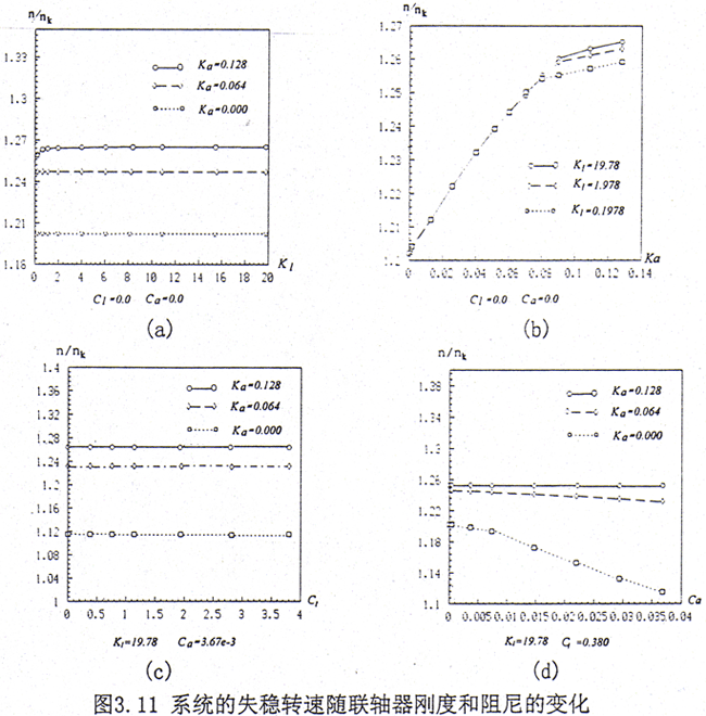 從圖3.11a可見隨橫向剛度的增大系統(tǒng)的失穩(wěn)轉(zhuǎn)速幾乎沒有變化,只有在轉(zhuǎn)角剛度較大而且橫向剛度較小時(shí),系統(tǒng)的失穩(wěn)轉(zhuǎn)速才有所變化。圖3.11b表示系統(tǒng)失穩(wěn)轉(zhuǎn)速隨轉(zhuǎn)角剛度的變化,系統(tǒng)的失穩(wěn)轉(zhuǎn)速隨轉(zhuǎn)角剛度變化顯著。在轉(zhuǎn)角剛度較小時(shí),幾乎是線性增加。當(dāng)轉(zhuǎn)角剛度達(dá)到某一值時(shí),失穩(wěn)轉(zhuǎn)速變化趨緩。進(jìn)一步的計(jì)算表明,當(dāng)繼續(xù)增大轉(zhuǎn)角剛度,系統(tǒng)的失穩(wěn)轉(zhuǎn)速趨于一定值。原因是當(dāng)轉(zhuǎn)角剛度增大到某值時(shí),在齒輪嚙合處已接近于一剛性連接的結(jié)構(gòu),如果繼續(xù)增大轉(zhuǎn)角剛度則對(duì)整體系統(tǒng)的剛度影響不大,因此系統(tǒng)的失穩(wěn)轉(zhuǎn)速變化不大。對(duì)齒輪聯(lián)軸器而言,一般橫向剛度是比較大的,因此對(duì)系統(tǒng)的失穩(wěn)轉(zhuǎn)速的影響可不予考慮。在轉(zhuǎn)角剛度較小時(shí),系統(tǒng)的失穩(wěn)轉(zhuǎn)速隨轉(zhuǎn)角剛度的增加而增加,所以轉(zhuǎn)角剛度對(duì)系統(tǒng)的失穩(wěn)轉(zhuǎn)速影響必須予以考慮。轉(zhuǎn)角剛度與輪齒有效接觸齒寬b的平方成正比,而有效接觸齒寬b主要與聯(lián)軸器的齒形和內(nèi)外齒間的接觸情況有關(guān),一般而言b值較少,對(duì)于修形齒和鼓形齒則更小。關(guān)于輪齒的接觸情況則比較復(fù)雜,當(dāng)不考慮輪齒的誤差時(shí),則主要受工況的影響,不同的工況接觸情況不同,即使在同一工況下也會(huì)有所變化,因此對(duì)于具有情況應(yīng)區(qū)別對(duì)待。