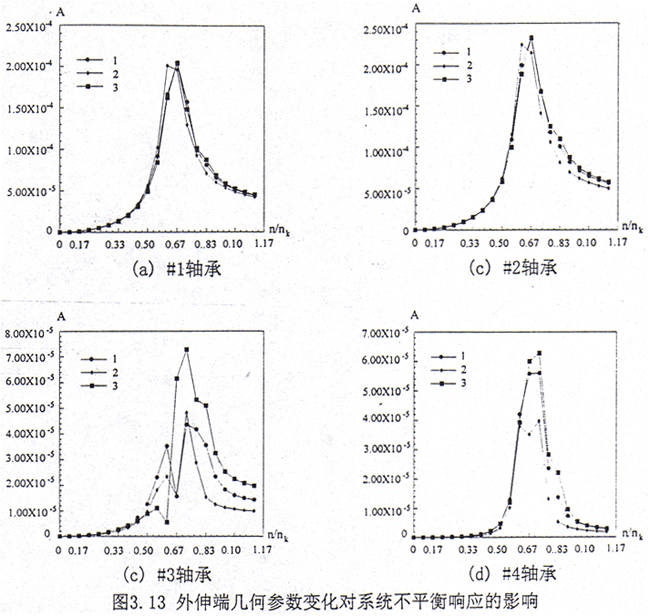 從上面的計(jì)算可見,在給定的條件下,轉(zhuǎn)子外伸端的幾何參數(shù)對(duì)在#1、#2軸承處的不平衡響應(yīng)影響不大;對(duì)#3、#4軸承處的不平衡響應(yīng)有影響,但量級(jí)較小,因此可以認(rèn)為外伸端的幾何尺寸對(duì)系統(tǒng)的不平衡響應(yīng)影響較小。